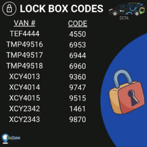 The lockbox codes below allow authorized drivers to unlock any VAN that uses a lockbox. Only use these codes for assigned shifts and authorized vehicles.